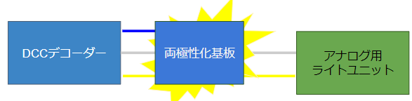 DCCデコーダとライトユニットの間に取り付けるだけで、ヘッドライト、テールライトの