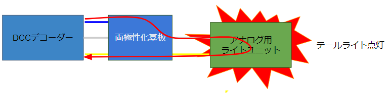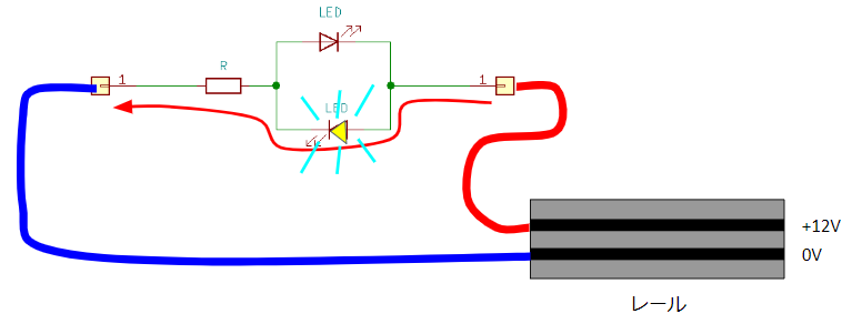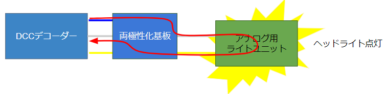 レールの電圧(極性)で、ヘッドライトが点灯または、テールライトが点灯します。