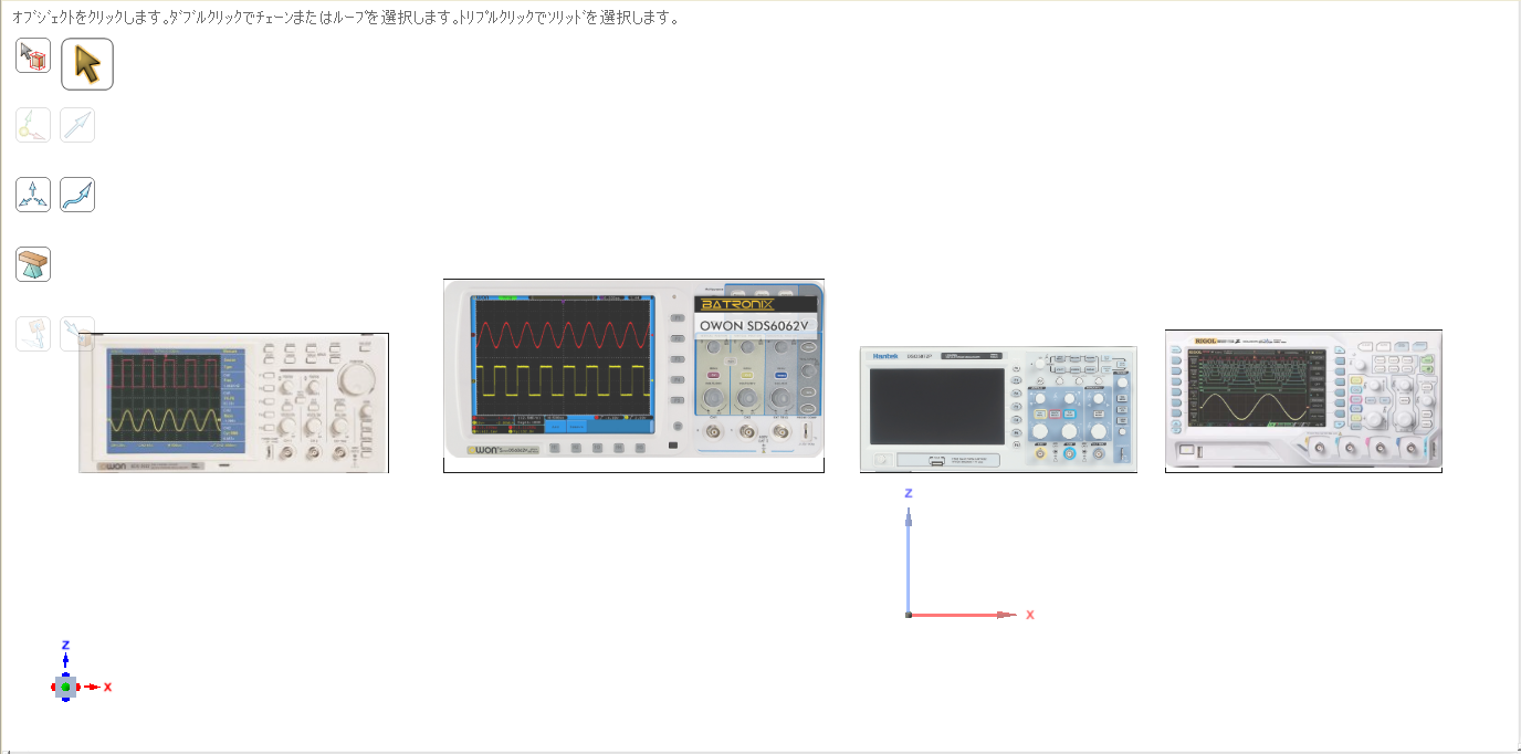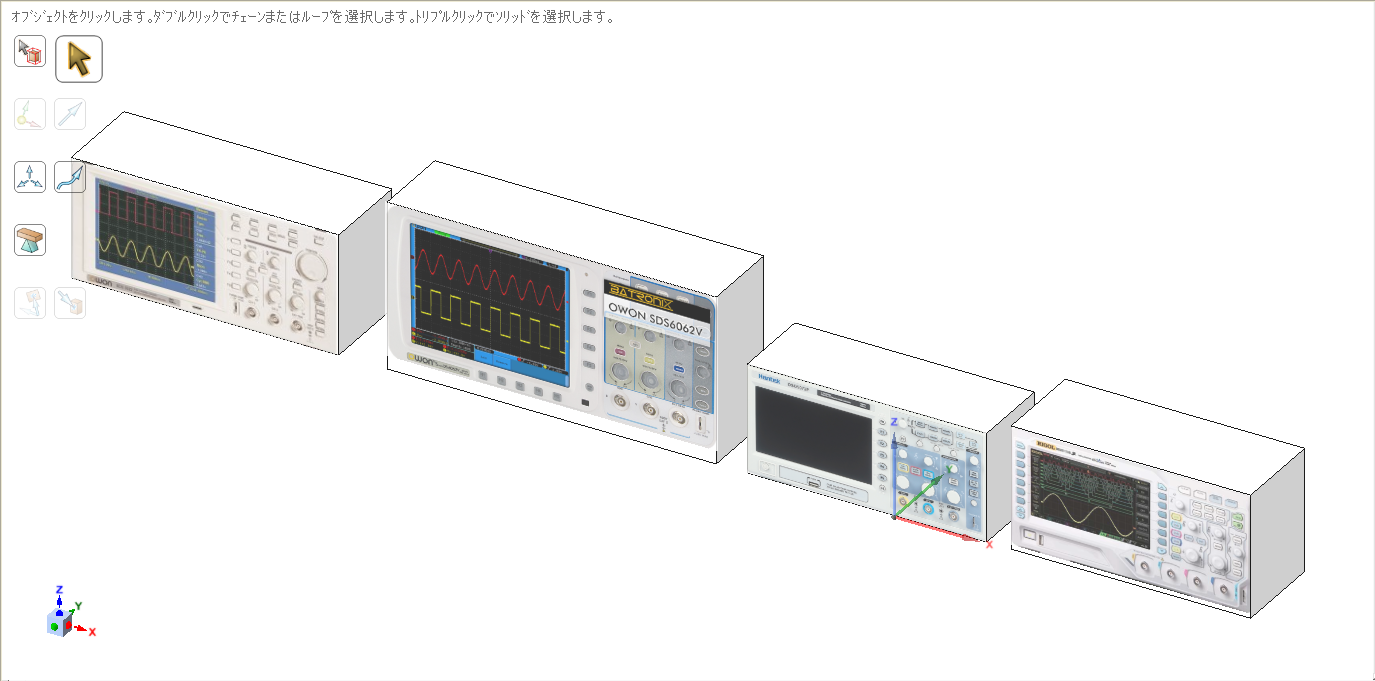 左からOWON SDS5022、OWON SDS6062、Hantek DSO5072、RIGOL DS1054Z