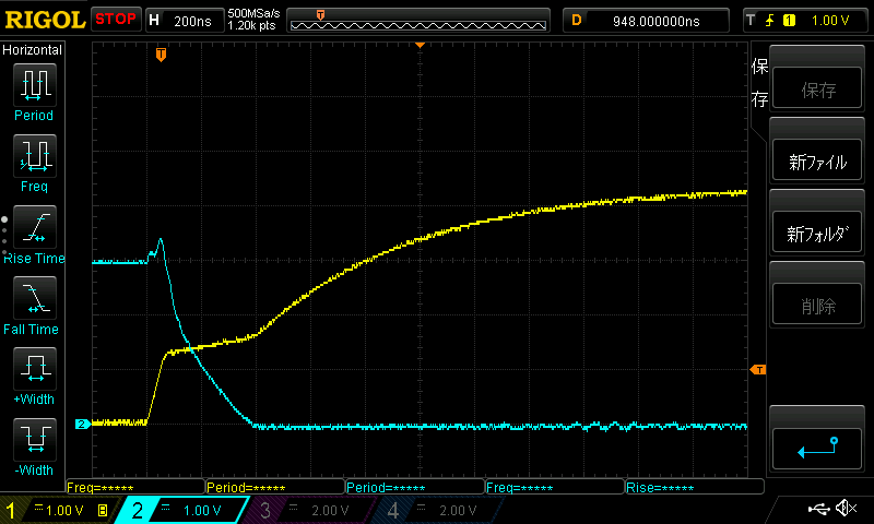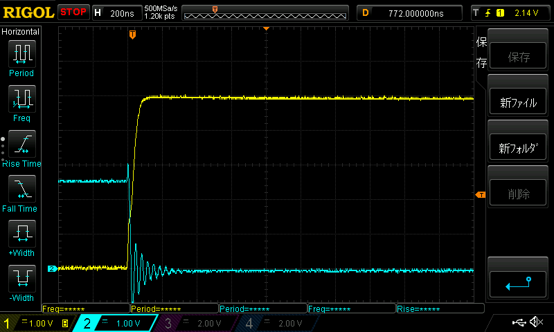 ・CH1:黄色:G-S間電圧波形 // CH2:水色:D-S間電圧波形