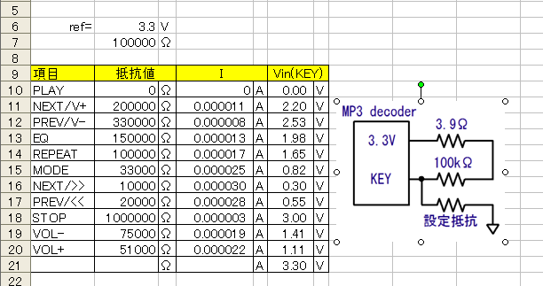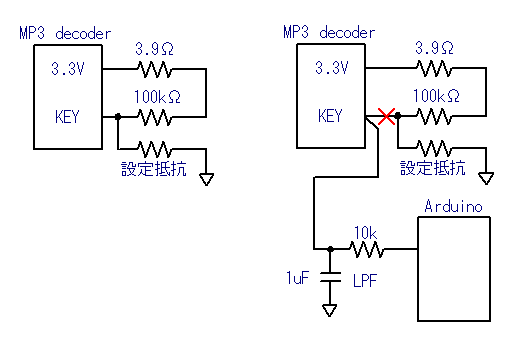 の続きです。多分、MP3チップに電圧を入れると、ボタンが設定された事と同じ