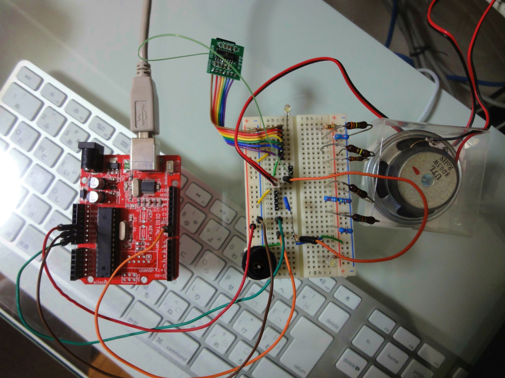 スピーカーはICへ直結です(^^; 白LEDを付けたので、ビカビカしますw