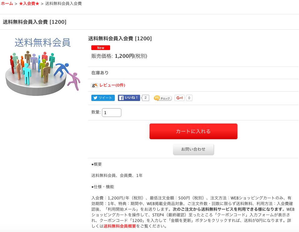 なんと、年間1200円を払うと500円以上購入で送料無料だそうです。