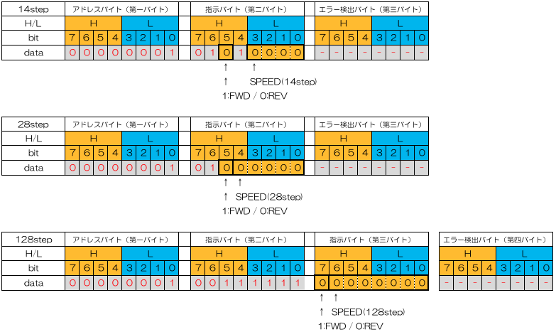 まずは、DCCパケットの違いを表でまとめてみました。