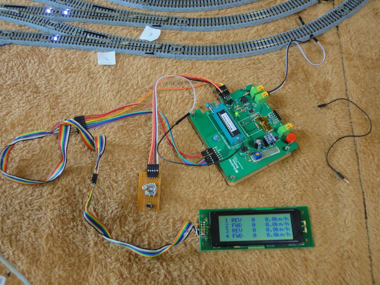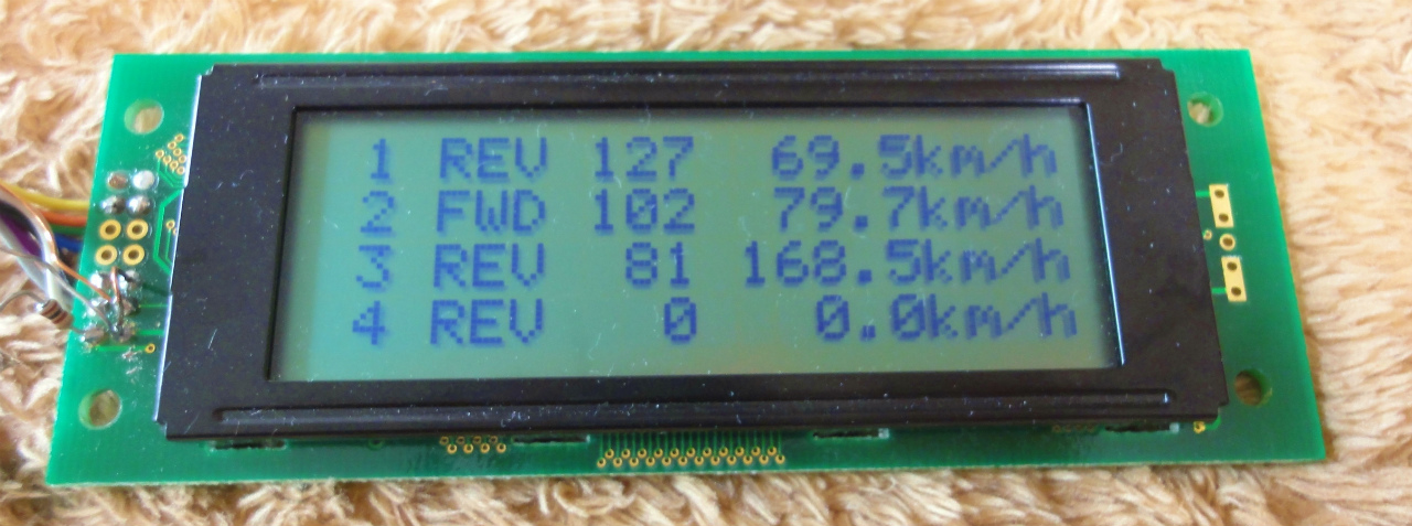 表示器にはDCCアドレス、進行方向、スロットル値、実速度変換値を表示しています。