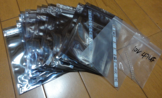 おまけの生基板1枚と、実験用に入れてもらった10V47uFのタンタルコンデンサ。