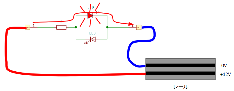 レールの電圧(極性)で、ヘッドライトが点灯または、テールライトが点灯します。
