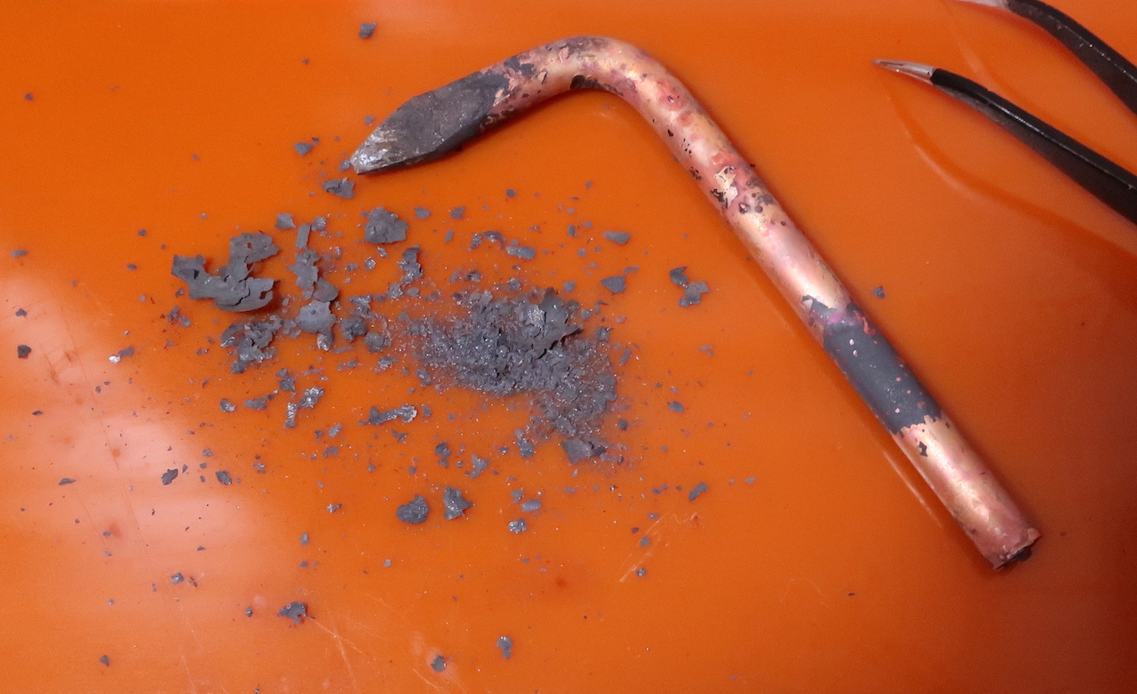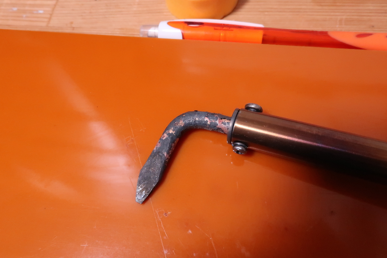 さて、自作ハンダこて先ですが、銅が酸化してカサブタみたいになっていました。