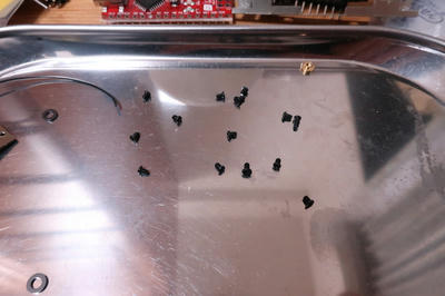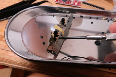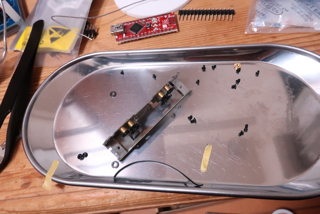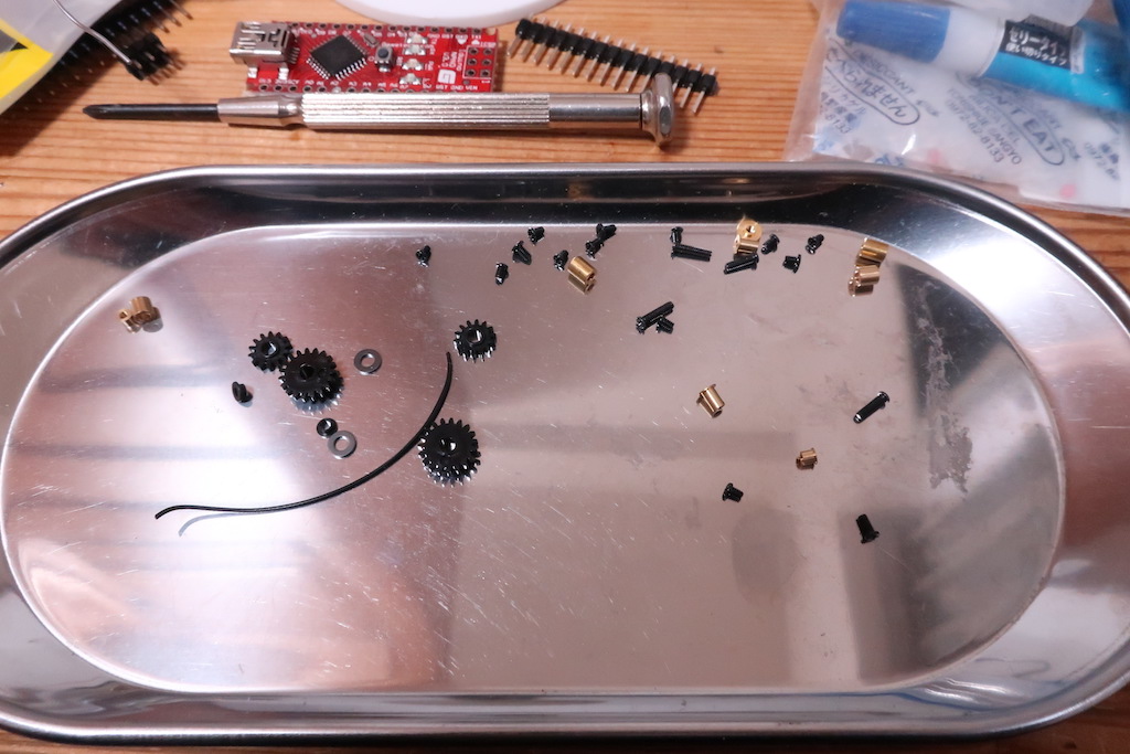 ギア部分の組み立てのため、ステンレス小皿に細かい部品を出します。