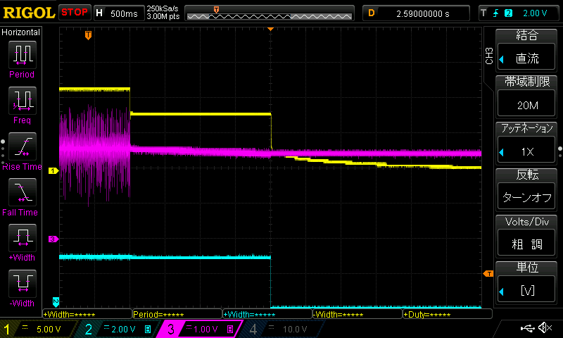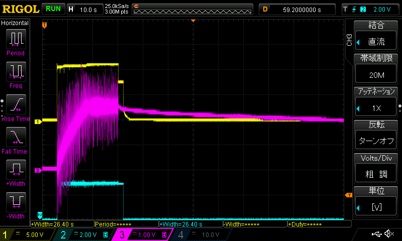150mS後にChage信号:水色が見えて、スーパーキャパシタ電圧(桃)が