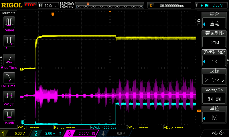黄:12V、桃:スーパーキャパシタ電圧、水:デコーダからの信号