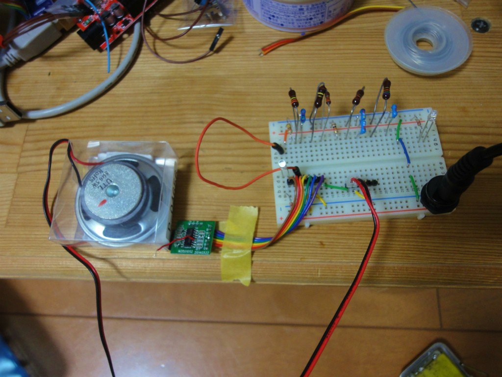スピーカーはICへ直結です(^^; 白LEDを付けたので、ビカビカしますw