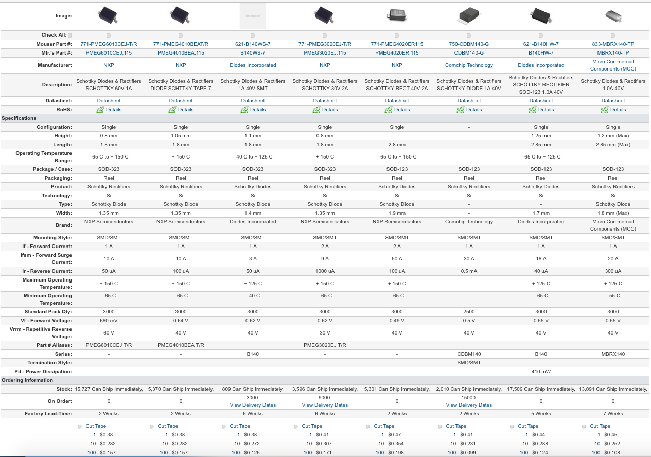 今はショットキダイオードは S4 diodeという物を選んでいますが、elecowでmouserから部品調達