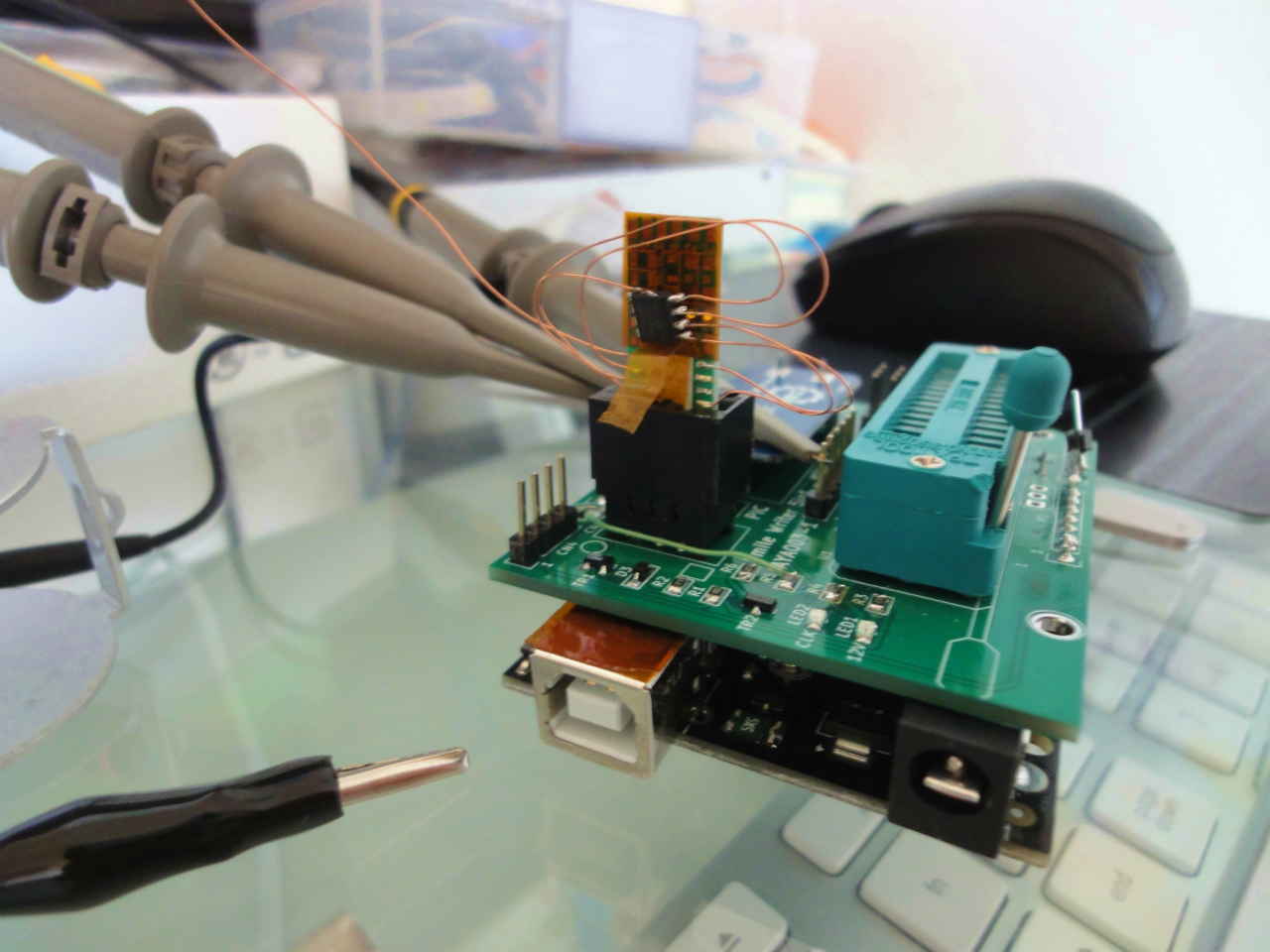 下記写真のように、ATtiny85をICクリップで挟んでスケッチを書き込めます!
