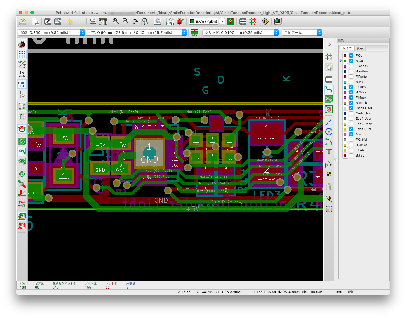 押しのけ配線機能の影響で、基板外形から+5Vラインがはみ出していますw