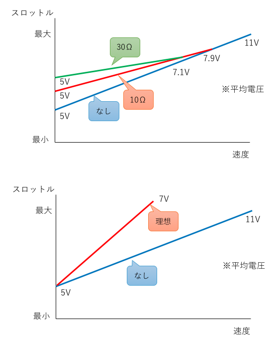 理想は、スロットル位置による開始電圧は同じで、スロットル最大時の平均電圧だけ