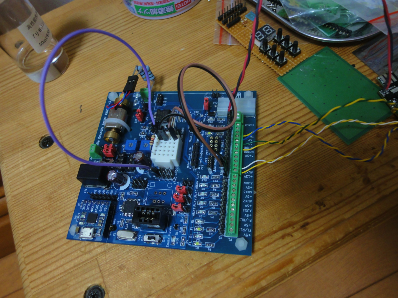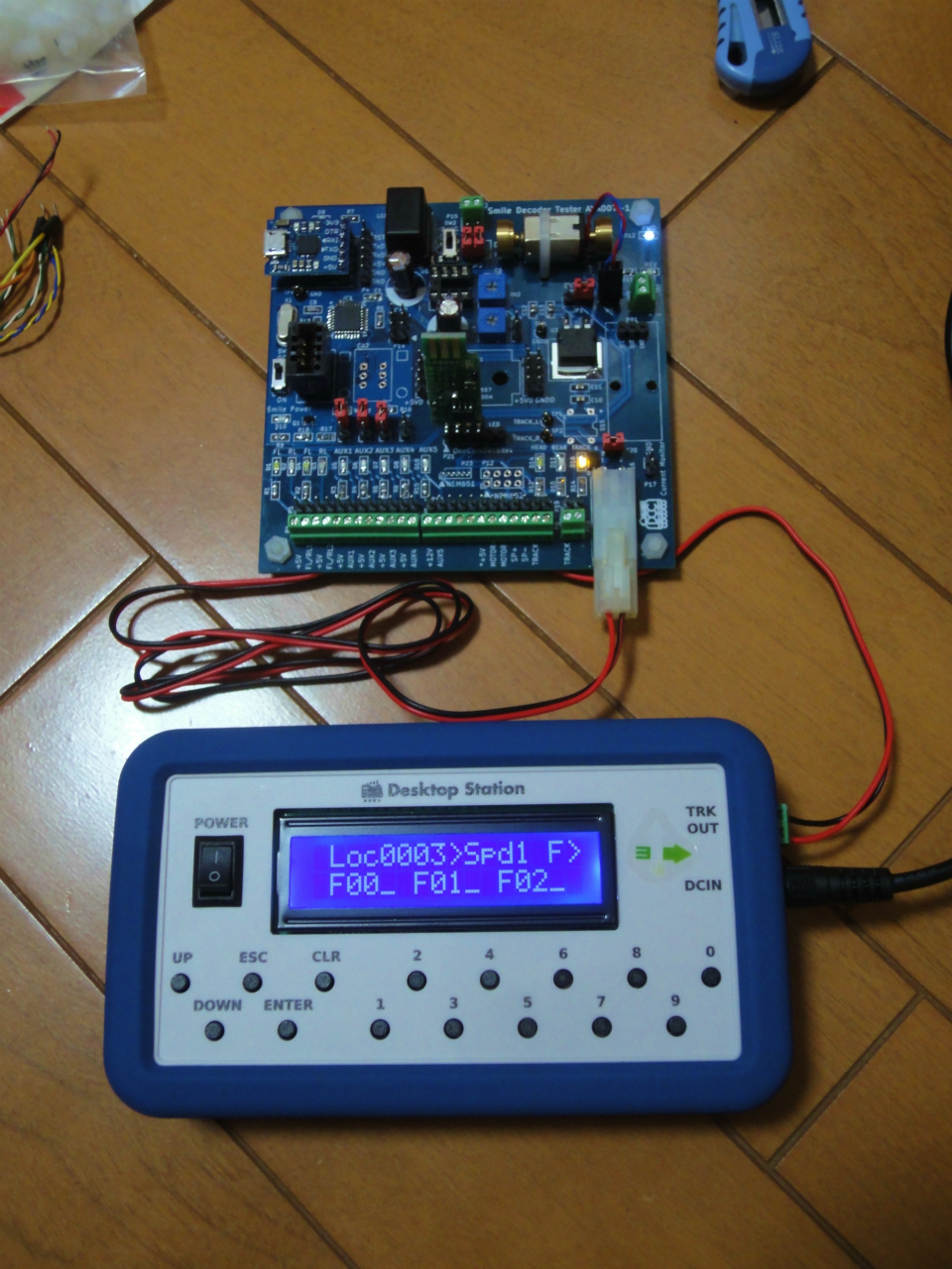 デコーダテスターに配線を接続して、モーターはタイラップで固定ました。