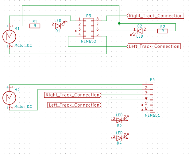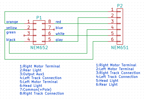 NEM651とNEM652に、モーター、LED、DCCを配線すると以下の様な図になります。